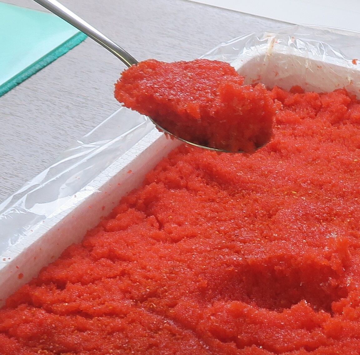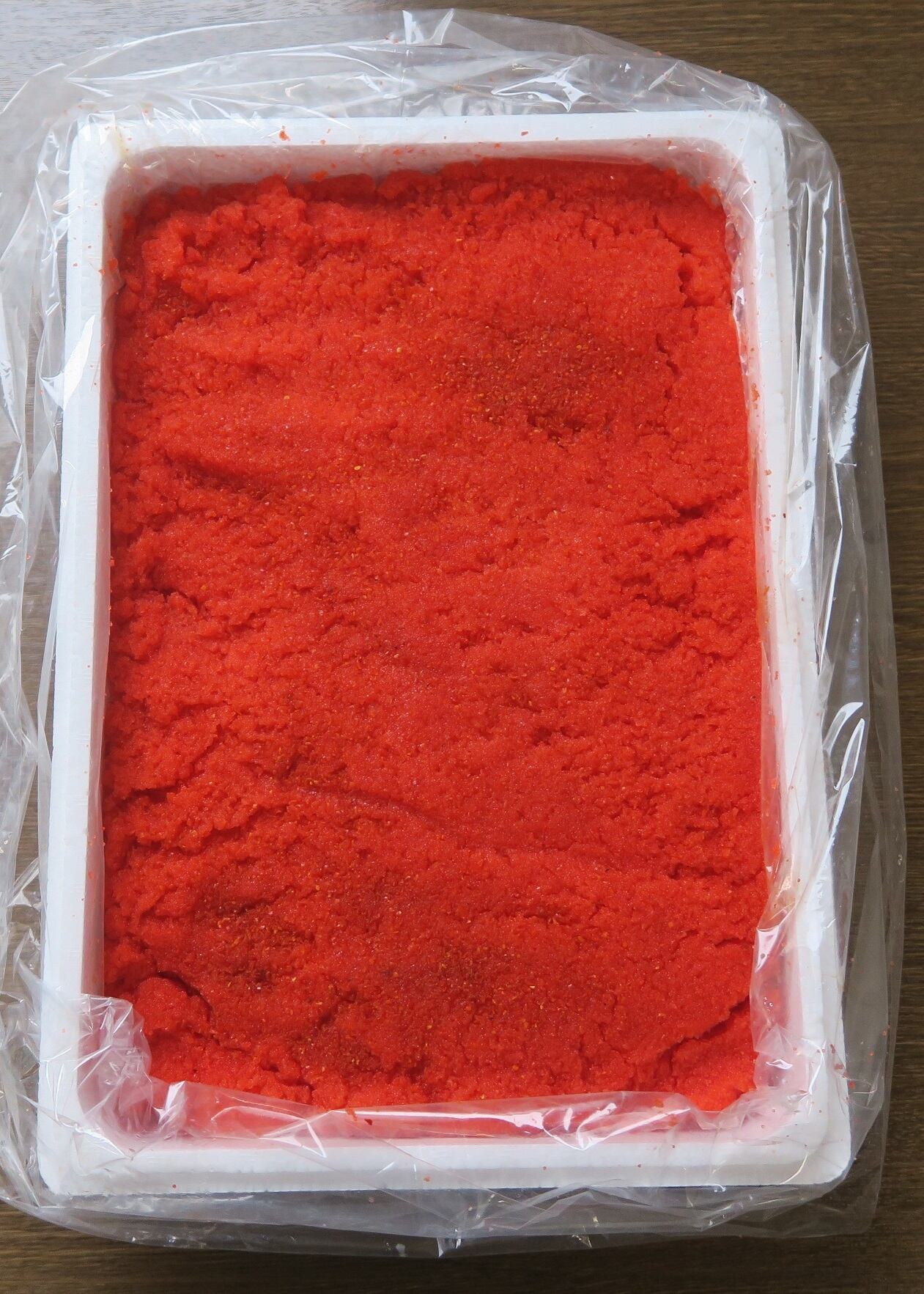 原材料名:助宗鱈の卵(北海道産)、食塩、米発酵調味料、唐辛子、還元水飴、鰹節エキス、米酢、魚醤、蛋白加水分解物、酵母エキス、鰹エキス/調味料(アミノ産等)、酸化防止剤(V.C)、ナイアシン、pH調整剤、酒精、トレハロース、着色料(赤102、黄5)、発色剤(亜硝酸Na)、酵素